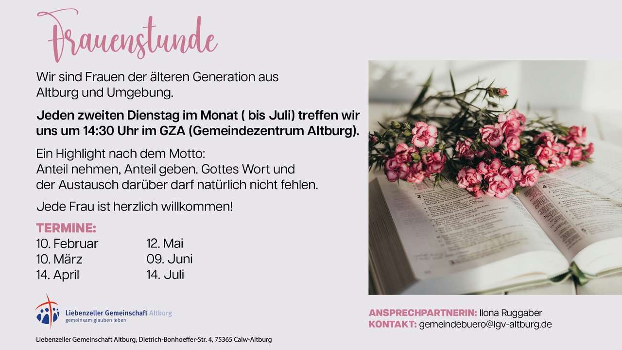 Jeden zweiten Dienstag im Monat treffen wir uns um 14:30 Uhr treffen wir uns im GZA (Gemeindezentrum Altburg). Ein Highlight nach dem Motto: Anteil nehmen, Anteil geben. Gottes Wort und der Austausch darüber darf natürlich nicht fehlen.
